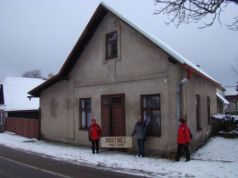 Tichou a liduprázdnou vesnicí jsme odcházeli od Volákova výměnku a zajímalo nás, kde asi bývala hospůdka V malé chýši, kam veselá společnost malířů chodívala, a v níž obsluhovala milá babička-hospodská Kristina Polanská (to jsme vyčetli na infotabuli). V dálce se objevil jeden místní, jehož jsme se na to optali. A on: „No přece tady“ a ukázal na stavení, před nímž jsme stáli. Šibalsky zamrkal: „Ukážu vám vzácnost, původní vývěsní štít z doby babičky Polanské“, přistoupil ke dveřím, odemkl a tabule se po letech podívala na svět a do Mirkova objektivu.