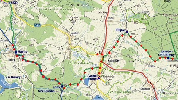 Trasa: Hamry – Lány – Kameničky – Volákův statek – Filipov – pramen Chrudimky a zpět = 20 km