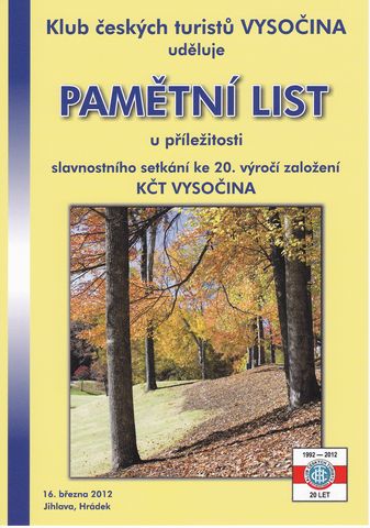 Po dlouhém informativním úvodu jsem se dostala k tomu, abych zaznamenala, že v pátek odpoledne 16. března 2012 se sešli zástupci většiny z 22 registrovaných odborů KČT, aby si připomněli, že je to už dvacet let, co vytvořili krajské sdružení, které si v průběhu let vydobylo na Vysočině respektovanou pozici a je pro svoji činnost veřejností kladně vnímáno – dokonce i představitelé měst a obcí, v nichž odbory KČT působí, velmi oceňují dobrý vliv na život občanů.