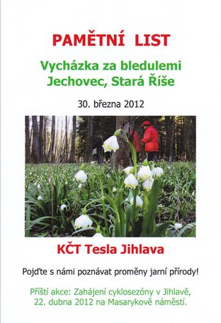 Páteční odpolední vycházka, připravená předsedkyní KČT Tesla Jihlava Ing. Mílou Bradovou jako příslib víkendových radostí a tečka za pracovním týdnem, přilákala asi patnáct poeticky naladěných turistů odhodlaných severáku navzdory vykonat pravidelnou bledulovou pouť na Jechovec.