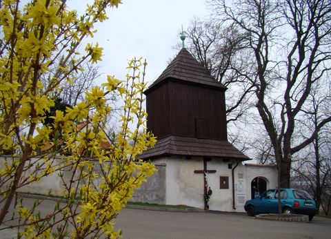 Kostel obklopený hřbitovem má odděleně stojící zvonici se šindelovou střechou,