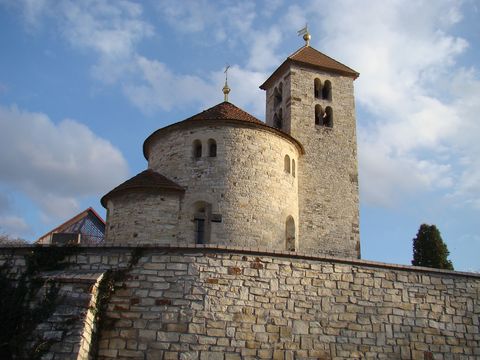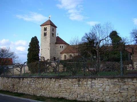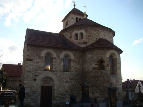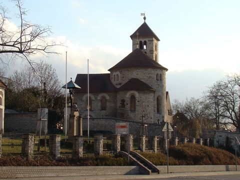 Původní románská centrální stavba se čtvercovou lodí s polokruhovými apsidami na každé straně pocházela z poloviny 12. století, později k ní byla přistavěna hranolová věž.