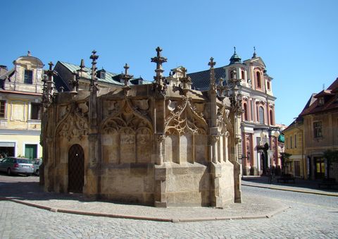 Slavná gotická kamenná kašna na Rejskově náměstí je jednou z několika vodních nádrží, které byly v Kutné Hoře vybudovány kvůli potížím se zásobováním pitnou vodou, způsobeným intenzivní důlní činností. Voda přitékala do nádrží dřevěným potrubím třeba i z dálky několika kilometrů. Na konci 15. století vybudoval tuto nádhernou kašnu Matěj Rejsek, jeden ze stavitelů chrámu sv. Barbory. Na obrázku vidíme v pozadí i barokní kostel sv. Jana Nepomuckého, vystavěný Františkem Maxmilianem Kaňkou (1674–1766) a Kiliánem Ignácem Dientzenhoferem (1689–1751).