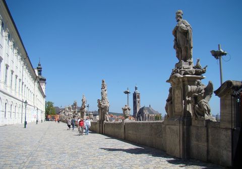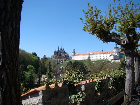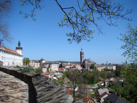 a hned potom přitáhne naši pozornost velkolepé panorama s chrámem sv. Barbory a Jezuitskou kolejí.