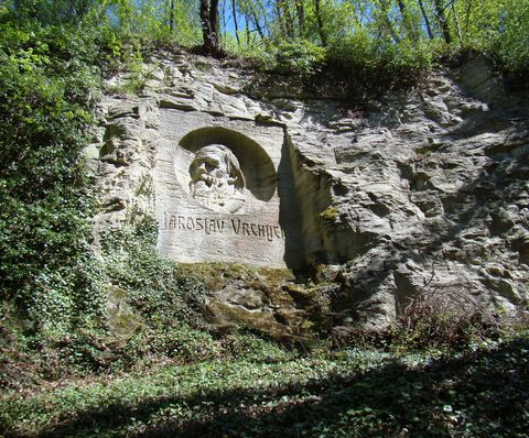 Tok říčky je dlouhý necelých třicet kilometrů, ale převýšení, které od pramene k ústí překonává, je 285 metrů – odtud i název – tekoucí z vrchů, tedy Vrchlice. V údolí je Naučná stezka, kterou nás vede červená turistická značka a hned na jejím začátku se ocitáme před reliéfem Jaroslava Vrchlického (1853–1912), básníka, jenž si podle této říčky, kterou miloval, zvolil svůj pseudonym. Reliéf byl vytesán v roce 1919, má rozměry 5 x4,5 metru.