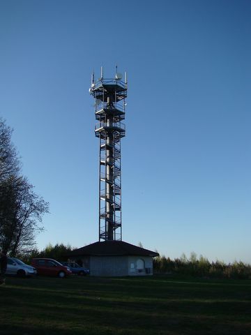 Nahoru na vyhlídkovou plošinu ve výšce 25 metrů vede 144 schodů a po jejich zdolání jsme ve slunci, které už putovalo k obzoru, pohlédli do kraje pod námi, stejně jako to činí stovky návštěvníků od roku 2002, kdy byla rozhledna 38 metrů vysoká zpřístupněna.