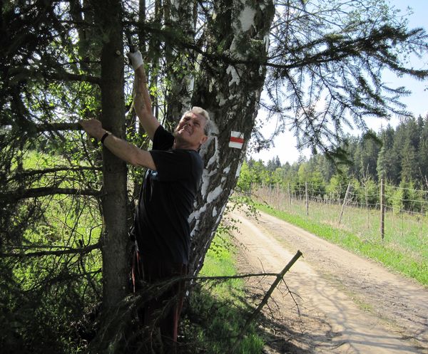 Poslední den měsíce dubna, který následoval po značkařské schůzce, na níž jsme dostali zadání pro obnovu značení v letošní sezóně, připadl na pondělí. Lehce jsme se shodli, že krásný slunečný den využijeme na přípravu červeně značené trasy ze Zaječího skoku směrem k Čeřínku. Pilka, nůžky a ocelový kartáč ve spojení s naším úsilím upravily a vyčistily trasu tak, abychom mohli příště začít v celém jejím průběhu obnovovat značky.