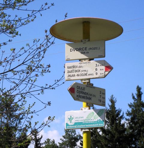 To „příště“ bylo ve středu 2. května a začínalo u směrovníku na Zaječím skoku. Na obrázku je vidět, že trasa na Čeřínek je dlouhá 13 kilometrů – my ji máme podle cestovního příkazu obnovit ve dvojici za dva dny.