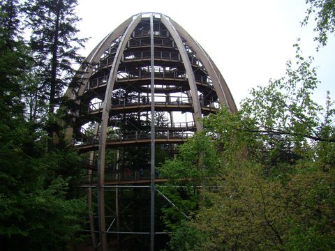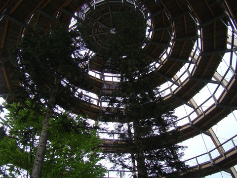 V sobotu 5. května jsme pár kilometrů za Strážným vjeli na území Národního parku Bavorský les a zamířili k městečku Neuschönau, abychom konečně zažili procházku v korunách stromů, na niž od září 2009 láká masivní reklama. Droboučce pršelo a okolní příroda byla čisťounká a zkřehlá, když jsme přišli ke věži, na niž je potřeba vystoupat, aby se člověk ocitnul ve výšce vrcholků okolních lesních velikánů a během necelého kilometru a půl špacíroval po dřevěné lávce ve výšce 8 až 25 metrů, nahlížeje z neobvyklého úhlu do života na vzrostlých smrcích, jedlích a bucích.