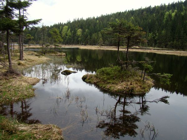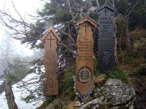 Autobus nás vyvezl do sedla Brennes na bavorské straně a už tady bylo nač se dívat, my jsme se však chutě vydali na lesní cestu k Malému Javorovému jezeru. Začátek naší trasy ozvláštnil pohled na „umrlčí prkna“, jež původně sloužila jako poslední lože těm z obyvatelů horských chalup roztroušených po okolních svazích, kteří zemřeli v zimě a nebylo je možné kvůli odříznutosti od světa řádným způsobem pohřbít. Až byli zjara uloženi do hrobu, na prkno se vyřezalo jejich jméno i případné zásluhy a vyzdobená památka se umístila buď na rozcestí či na místo, kde zemřelý rád trávil své chvíle – pocestní mu věnovali vzpomínku a modlitbu.