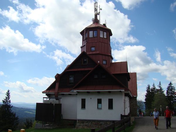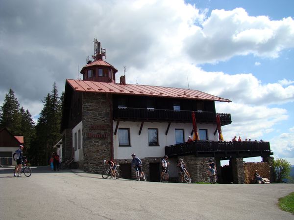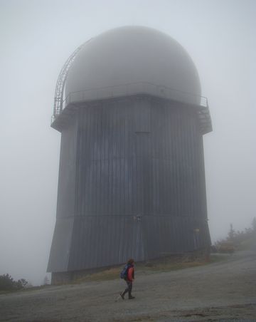 Pak jsme začali tvrdě stoupat a s přibývající výškou přibývalo zimy, větru deště a mlhy, takže jsme byli rádi, když jsme pod střechou verandy Chamerhütte, stojící kousíček od vrcholku Malého Javoru (1384 m), zhltli svoji svačinku a trochu posíleni se vydali sněhem k Velkému Javoru (1456 m), nejvyšší šumavské hoře. Musím říct, že koncový výstup byl z cesty, kterou jsme si vybrali, dosti obtížný. Pro hustou mlhu nebyly vidět dokonce ani dvě obrovské věže, v nichž je televizní vysílač a radarová a meteorologická stanice.