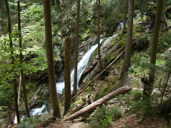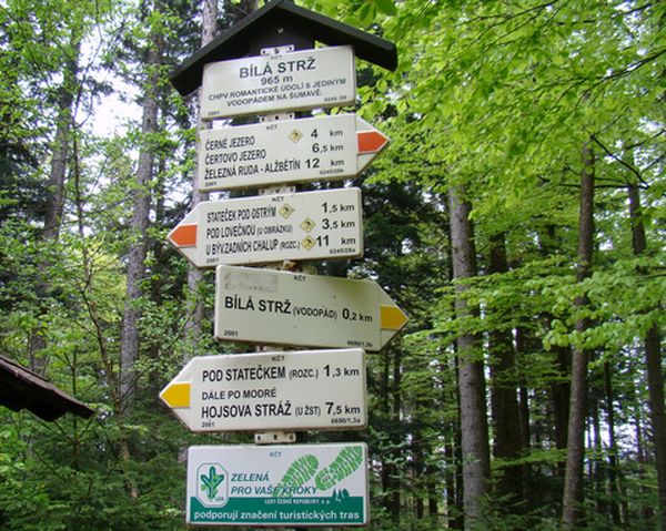 a kde jsme se napojili na modrou TZ a stoupali a stoupali… až k rozcestníku Pod Statečkem, kde jsme zahnuli vlevo po žluté TZ a zase do kopce až k Bílé Strži, kde nás kromě nádherného, prý více než 200 let starého lesa lákal ve výšce kolem 1000 metrů jediný šumavský vodopád (od Hojsovy Stráže je to asi 4 km jihozápadně).
