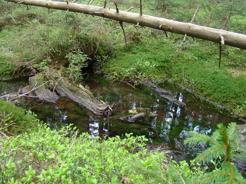 Asi kilometr dlouhý výstup (stále po ČTZ) do výšky 1159 metrů nás zavedl na hlavní evropské rozvodí, které probíhá mezi Černým a Čertovým jezerem v sedle zvaném Rozvodí, ležícím mezi Špičákem a Jezerní horou. K Čertovu jezeru jsme cupali po mechových stezkách, vedle nichž na nás mrkala malá rašelinná jezírka rozesetá po celém lese a ozdobená svěžími bahenními rostlinami.