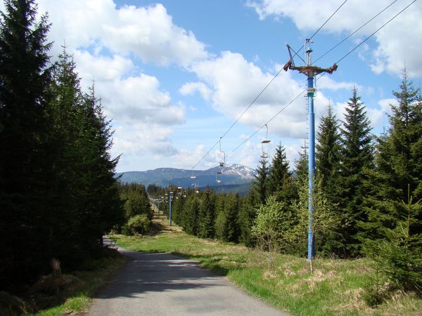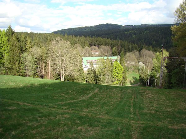 Naběhli jsme na modrou TZ směrem Železná Ruda a po čtyřech odpočinkových kilometrech na lesní silničce, většinou z kopce, jsme se po první sjezdovce spadající do údolí Řezné vydali travnatým svahem dolů k našemu hotelu. Zanedlouho už jsme viděli jeho střechu a tehdy jsme si uvědomili, že jsme vlastně unavení…