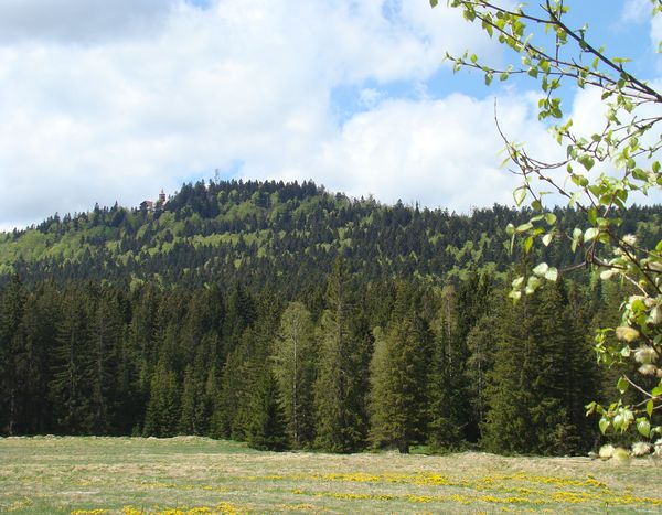 A teď zařadím fotku, kterou jsem neuměle upravila (kvůli mlžnému závoji a vzdálenosti), ale přesto je na ní zřetelně vidět to, za čím jsme dneska bez ohledu na potíže putovali na vrchol Luzného – březnická hájenka a celá paseka kolem ní!