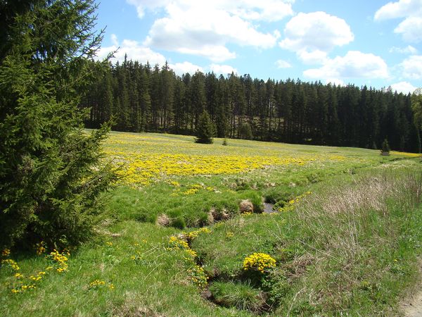 Obrovské květy tisíců blatouchů kolem Slatinného potoka, koberce dřípatek a nade vším oblaka, pro která užívám označení „barokní“, nás vyprovázely na zeleně značené cestě ke Gerlově Huti, výlet pomalu končil, nebylo už třeba slov…