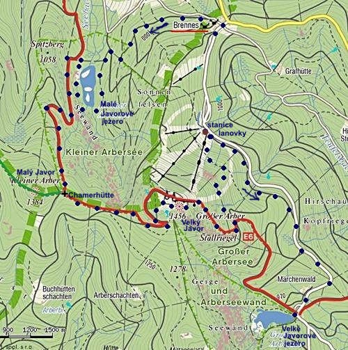 Trasa: sedlo Brennes – Malé Javorové jezero – Chamerhütte na Malém Javoru – Velký Javor – dolní stanice lanovky – Velké Javorové jezero = asi 20 km