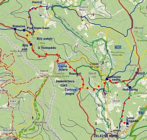 Dnešní trasa: Hamry – Pod Statečkem – Bílá Strž – Černé jezero – Rozvodí – Čertovo jezero – Špičácké sedlo – Hofmanky – Železná Ruda = 27 km
