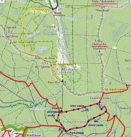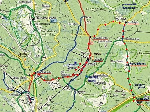 Trasa: Špičácké sedlo – pramen Úhlavy – Pancíř – Tomandlův křížek – Šmauzy – Nový Brunst – Gerlova Huť = asi 17 km
