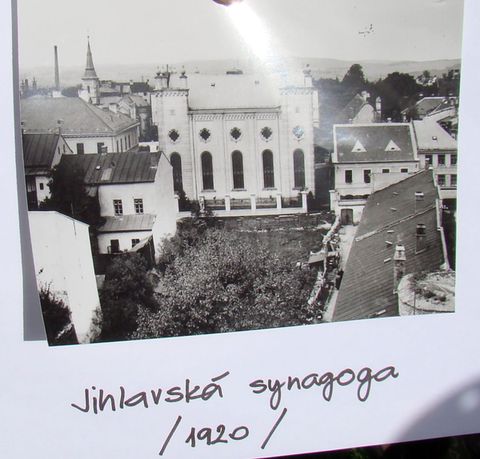 Pan Vilímek přinesl fotografii z roku 1920, na níž je zachycena část Jihlavy, kde stávala synagoga vystavěná v roce 1863 v maurském stylu – můžeme proto dobře porovnat s dnešním stavem