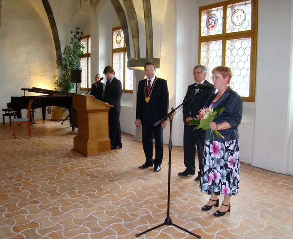 Při ceremoniálu nás tou ušlechtilou podvečerní hodinkou v efektních prostorách radnice, kde byli zároveň s Mílou Bradovou oceněni Ladislav Novický, Karel Paštyka, Miloš Podhorský a Občanské sdružení Jihlavský havířský průvod, provázela hudba v podání nejlepších žáků ZUŠ a roztomilí havířci.