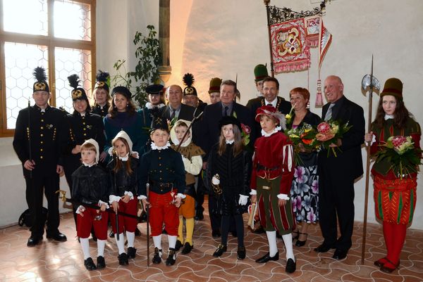 Památeční hromadné foto je exkluzivní a radostné nejen svým důvodem, ale i zásluhou barevných historických kostýmů členů „havířského sdružení“:
