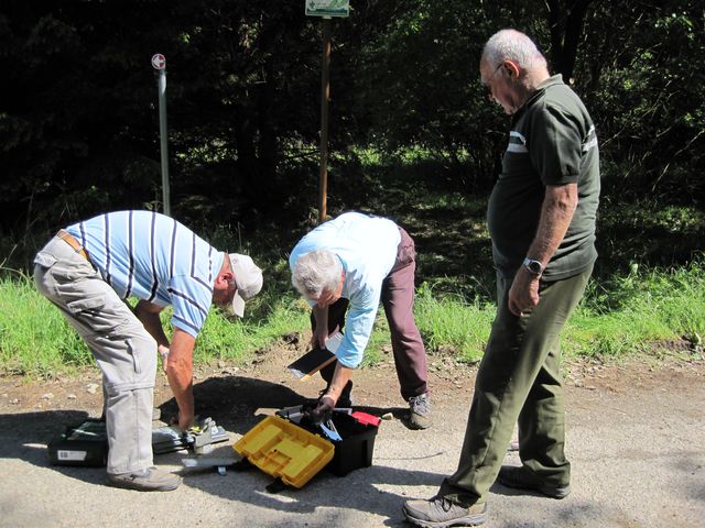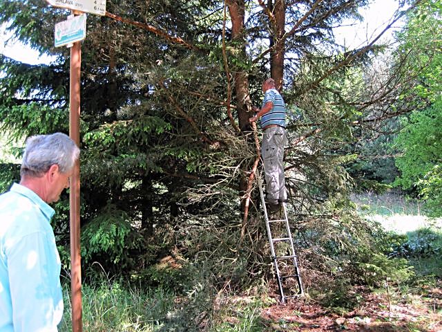 Vyřezané větve a křoviny jsme odklidili, aby místo nevypadalo jak po vichřici a mohla začít vlastní práce – nejdříve rozložit šikovný variabilní značkařský žebřík do potřebného tvaru a upevnit ho ke sloupku,