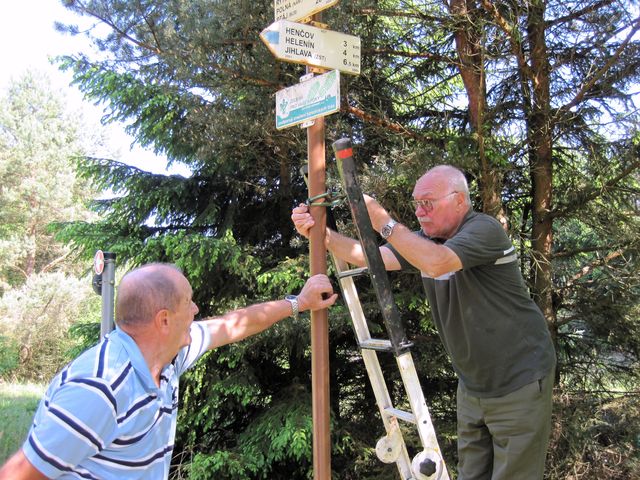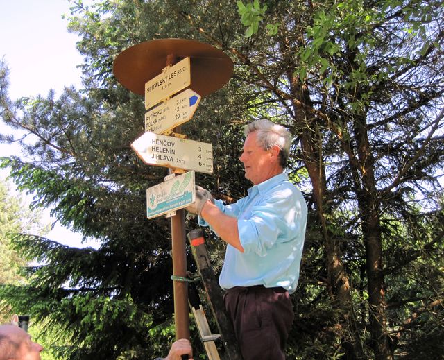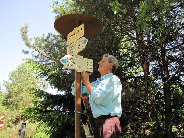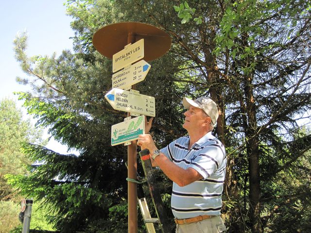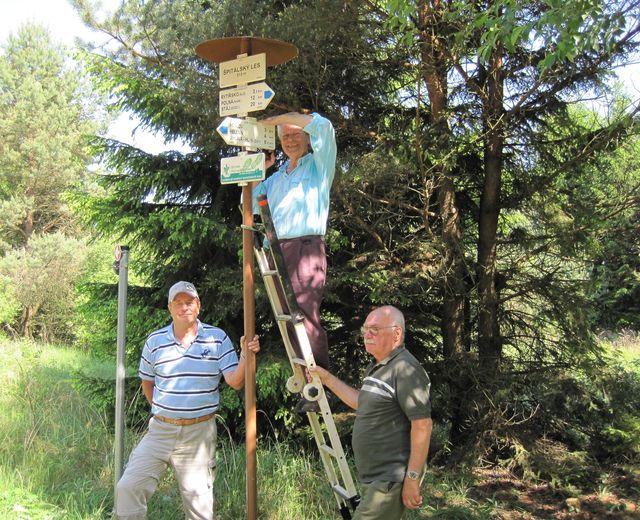 Po zaškolení jak vyměnit turistickou vývěsní mapu, byli jsme spolu s Václavem Plánkou pozváni hned druhý den na instruktáž o výměně směrovek. Ing. Ivan Bohatý, náš lektor, vybral směrovník s místním názvem Špitálský les, na němž byly unavené a orezlé směrovky z roku 2001.