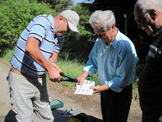 Plechové tabulky s textem se uchycují k ocelovým držákům pomocí nýtovacích kleští a věřte, že je k tomu kromě síly potřeba i šikovnost,