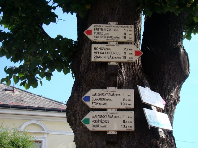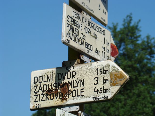 Stanuli jsme před dalšími směrovkami a uviděli, že je třeba odbočit po žluté značce – chudák rozcestník péčí příslušných značkařů nedotýkaný, opuštěný, leč do roztrhání těla pocestným sloužící…