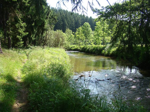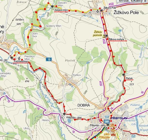 zjistíme, že vede většinou kolem vodních toků – nejdříve kolem Sázavy, pak okolo mlýnů u břehů Borovského potoka a v závěru po dobrodružně zarostlých březích Doberského potoka.