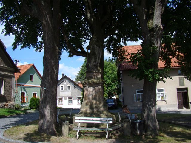 Na malém náměstíčku nás mezi třemi lipami přivítala velmi atraktivní barokní socha svatého Judy Tadeáše, apoštola Páně, na trojbokém podstavci s vytesaným českým textem (bohužel špatně čitelným), z něhož jsme vyrozuměli některé slavné skutky světcovy. Tento svatý je přímluvcem v těžké nouzi a zoufalých situacích – dobře je chápe, neboť jich bezpočet zažil při svém působení v Arménii a Persii (kde podlehl i mučednické smrti).