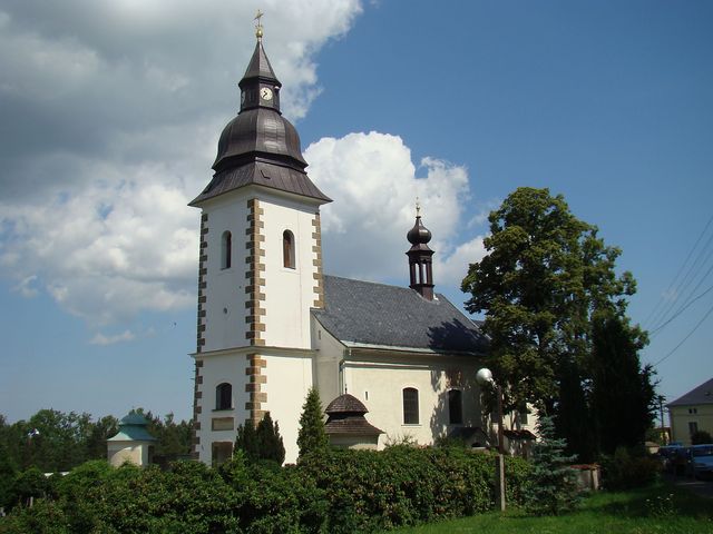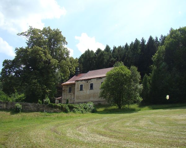 a po přečtení informační cedule na dveřích opravované stavby jsme zjistili, že tu stál původně kostel románský, byl obklopen vesnicí, ale ta už v 15. století zanikla. Kostel ve špatném stavu byl zbourán a v době barokní postaven na jeho místě nový. V lodi kostela jsou prý uchovány zbytky původního vybavení – hlavice románského sloupu a gotická křtitelnice.