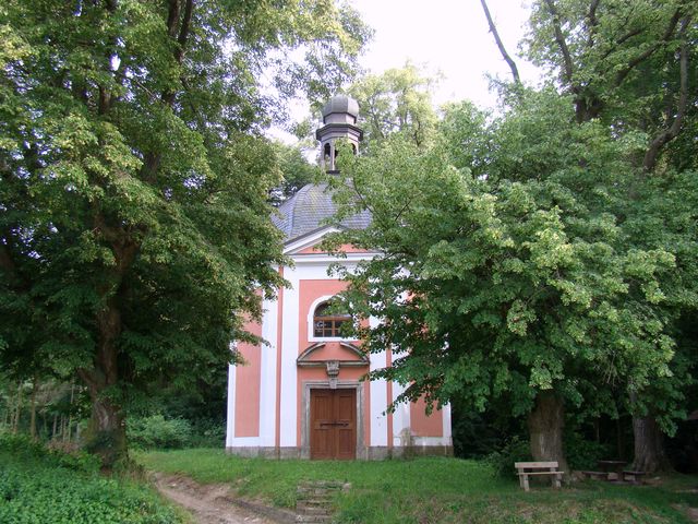 Naše trasa směřovala ke Košumberku, kolem kaple sv. Jana Nepomuckého, již zbudovali v polovině 18. století jezuité, po tzv. Andělské cestě, kudy prý andělé v noci poponášeli budované základy původní kaple Panny Marie Pomocné tak, až se osudem těžce zkoušená a hluboce věřící hraběnka Marie Maxmiliána, rozená ze Žďáru, rozhodla vybudovat kapli na Chlumu…
