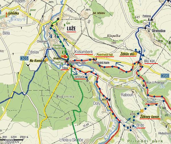 Trasa: Luže ZTZ – Košumberk ČTZ – Tišina – Janovičky – Brdo – Žižkovy šance – Rvasice ČTZ – Mlýn U Prokopa – Bílý Kůň MTZ – Žižkův stůl – Bílý Kůň ČTZ – Paletínská kaple – Košumberk rozc. ZTZ – Luže = přibližně 12 km