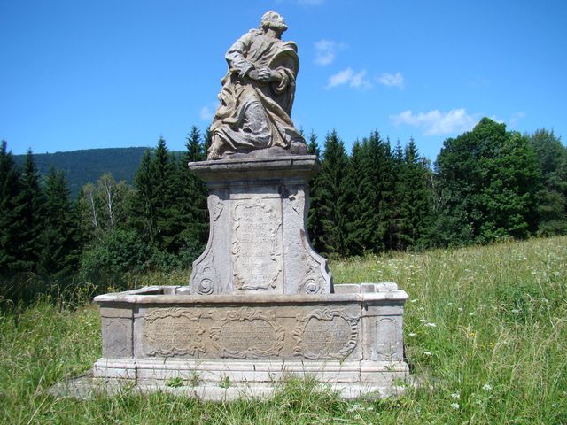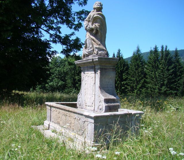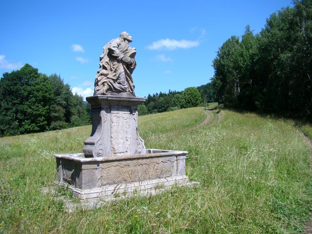 Pískovcová socha na vrcholu kopce má kolem sebe klekátko, které se podobá kašně – základ objektu je asi tři a půl metru krát dobré dva metry – skvělé!