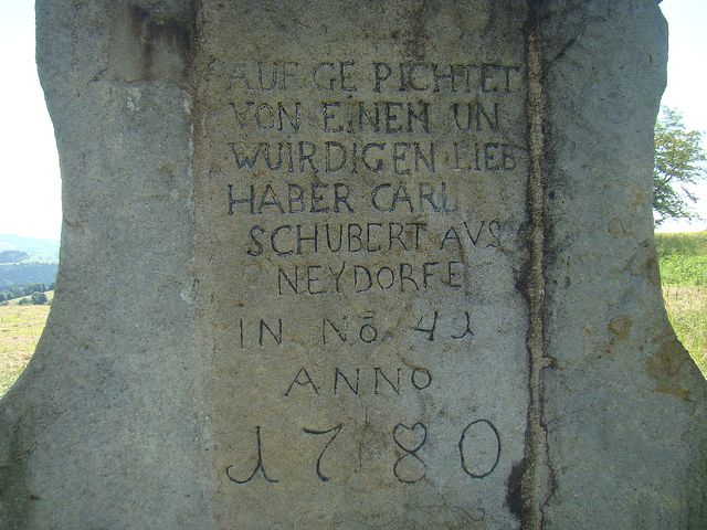I jeho dědeček Karel se hluboce zapsal do paměti lidí a zdejší krajiny – nechal totiž v roce 1780 na návrší mezi rodnou obcí a Vysokými Žibřidovicemi, kam Nová Ves patřila farností, na vlastní náklady postavit pískovcovou sochu Krista na hoře Olivetské. Umístění díla je unikátní a úchvatné, Karel Schubert tím projevil nevšední umělecké a náboženské cítění. Dva roky nato se finančně podílel na stavbě kaple Nejsvětější Trojice v Neudorfu; zemřel v roce 1787 jako vážený občan.