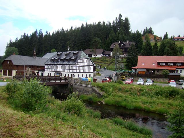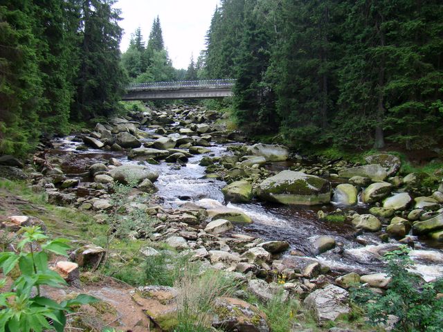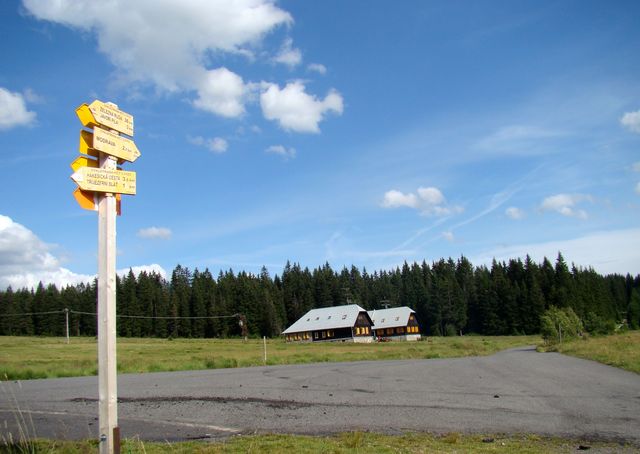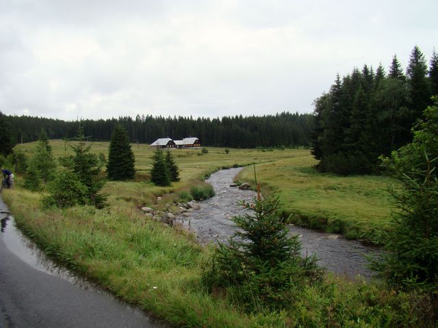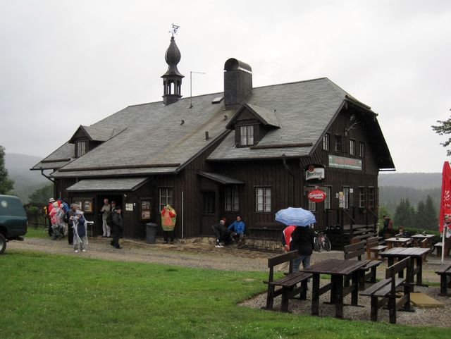 Zpětně to cítím tak, že jsme nedbali upozornění v podobě snesitelného deště a nezměnili své hloupé lidské plány – od této chvíle jsme překročili bludný kořen a všechno bylo špatně: v silném lijáku a kroupách (stále jsme byli ve výškách kolem tisíce metrů) jsme neodbočili na modře značenou cestu, ale pádili po červené značce. Vidím, jak se usmíváte – každý přece ví, že vede k Turnerově chatě… My jsme přes pláštěnky a zmrzlé ruce (měli jsme cyklorukavice) zjistili ten podraz, který na nás škodolibí lesní skřítkové připravili, až u žluté odbočky na bývalou Hálkovu chatu. Nezbývalo než se několik kilometrů vrátit k mostu a pokorně se vydat tou správnou cestou… Stalo se.