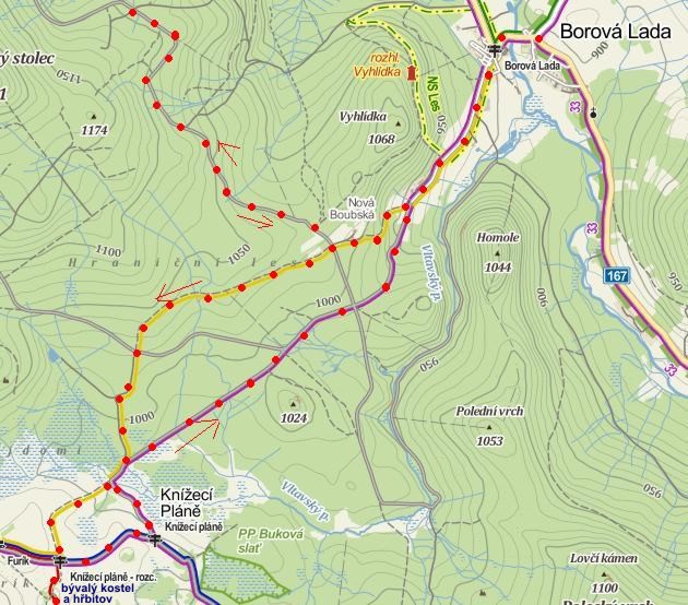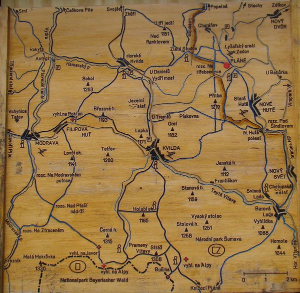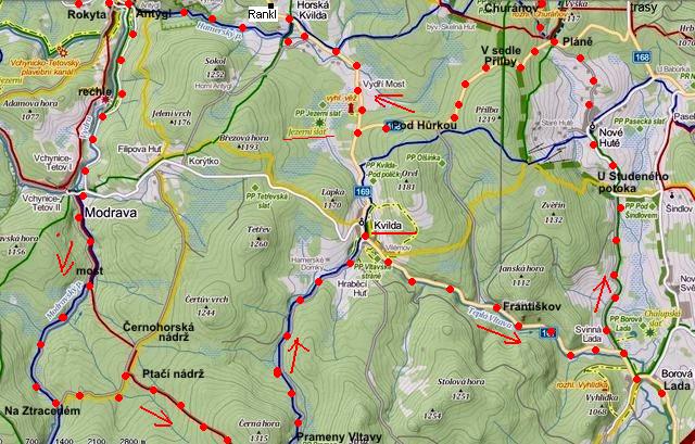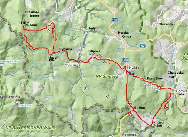 Naše trasa: Borová Lada – Svinná Lada – Nové Hutě – Pláně – Churáňov – Pláně – V sedle Přilby – Jezerní slať – Horská Kvilda – Rankl – Hamerský potok – Antýgl – Rokyta – rechle – Modrava – Na Ztraceném – Ptačí nádrž ČTZ – Černá hora – prameny Vltavy MTZ – Kvilda – Borová Lada = 57 km