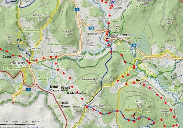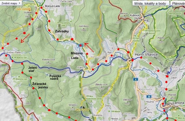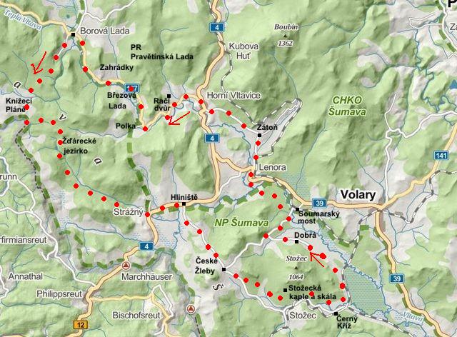 Průběh dnešní trasy: Borová Lada – Knížecí Pláně MTZ, ZTZ – Žďárecké jezírko – Strážný – Hliniště – České Žleby – Stožecká skála – Vltavský luh – Dobrá – Lenora – Zátoň – Horní Vltavice – Račí dvůr – u Polky – Borová Lada = 60 km + 2 km pěší