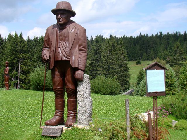 Brouzdala jsem na netu a zjistila, že 213 centimetrů vysoký Josef Klostermann se narodil v Ranklově, dnes zaniklé, vysoko položené osadě poblíž Horské Kvildy. Dožil se 69 let, zemřel v lednu 1888 a jeho tělo prý bylo podle zvyklostí uloženo na umrlčí prkno a ve sněhu za domem čekalo na pohřbení do jarní rozmrzlé země. Pochován byl ve Stachách, dodnes je tam pomníček, jeho žena zemřela za 40 let po něm (byla asi o 20 let mladší – viz historka uvedená ve článku z roku 2010).