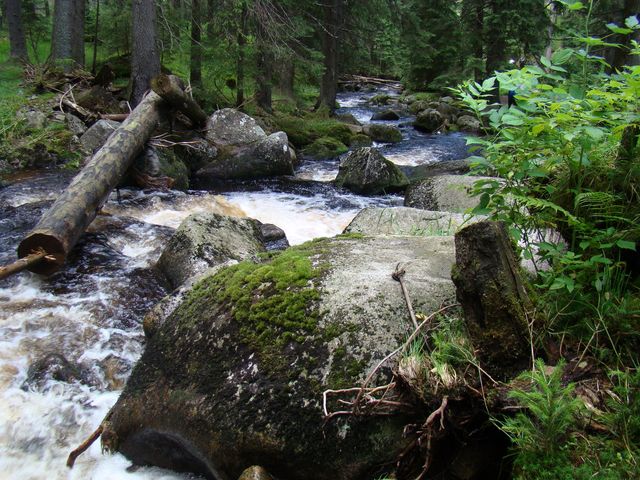 Nás, ukolébané šumavskou zelení a tichounkým šuměním vody, vytrhla z mírné letargie vydatná přeháňka. Donutila nás zamyslet se nad dalším pokračováním trasy, ale když skončila, rozhodli jsme se neměnit původní plán. I vydali jsme se k mostu v Antýglu, abychom podél Hamerského potoka dojeli na Horskou Kvildu a pak domů.