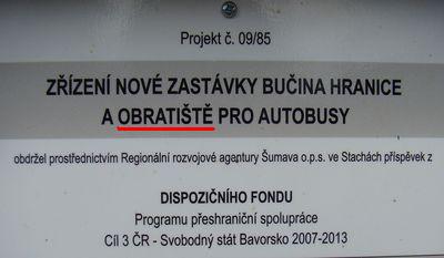 Právě odjížděl autobus na plyn, který sem jezdí z Německa – turisté pak pěšky překročí hranice a mohou na českém území znovu nastoupit do autobusu či pokračovat po svých. Na zastávku, kde má český autobus točnu, jsme se zajeli také podívat – a ejhle, spatřili jsme ceduli tohoto znění: