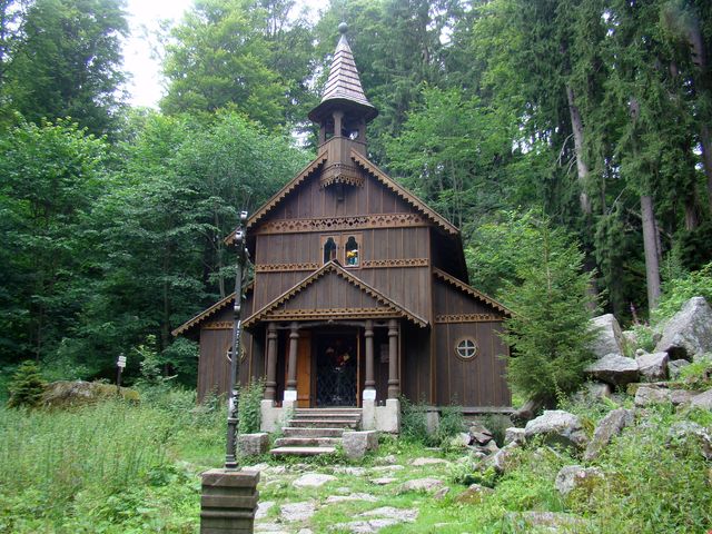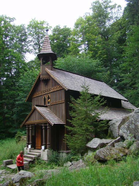 Ke kapli Panny Marie s léčivým pramenem, která je poutním místem od konce 18. století, jsme museli bez kol – kopec je dosti strmý. V dobách Zlaté stezky prý zde stával strážní hrad, kolem skály je dosud původní, tzv. hercynský les, což byla klenová jedlobučina. Kvůli nesnadné dostupnosti unikl les vykácení pro potřeby sklářských hutí – v jiných místech, kde se před dvěma sty lety vysazovaly nově smrky, podléhají stromy kůrovci a vichřicím.