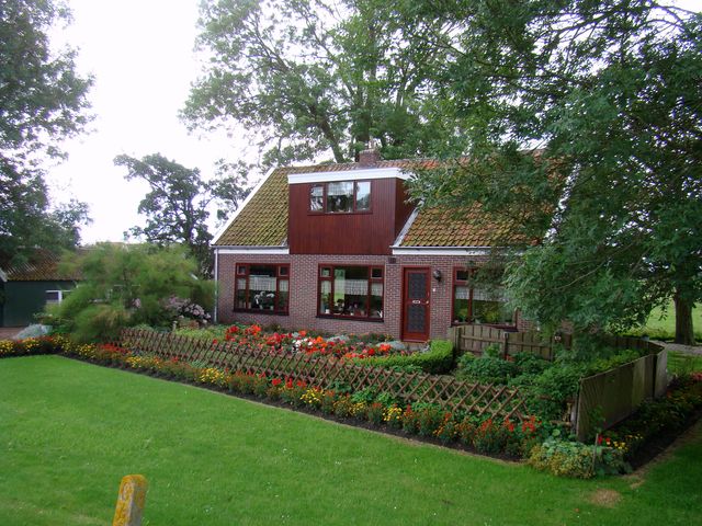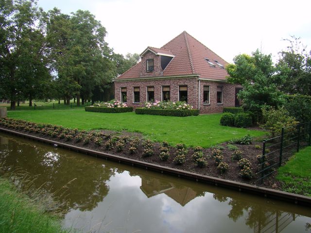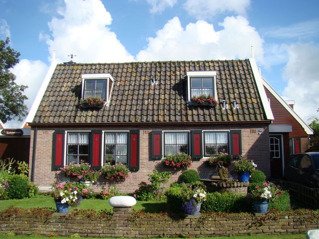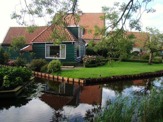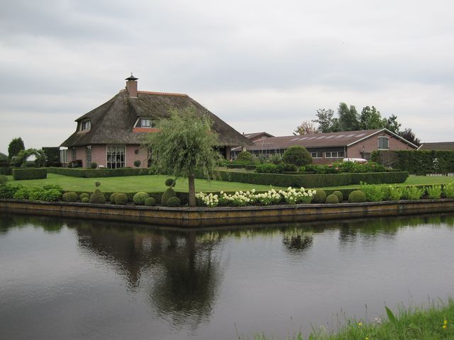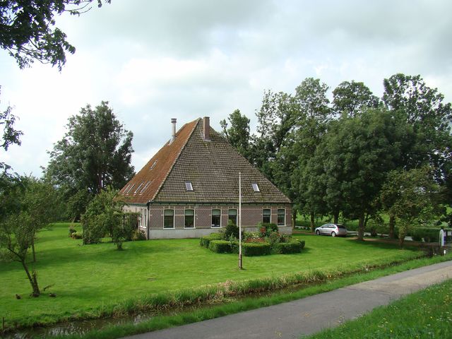 Všimněte si domů v provincii Severní Holandsko – obytné prostory, stodola i mlat se dříve nacházely pod jednou stanovou střechou, statky stojí v závětří stromů.
