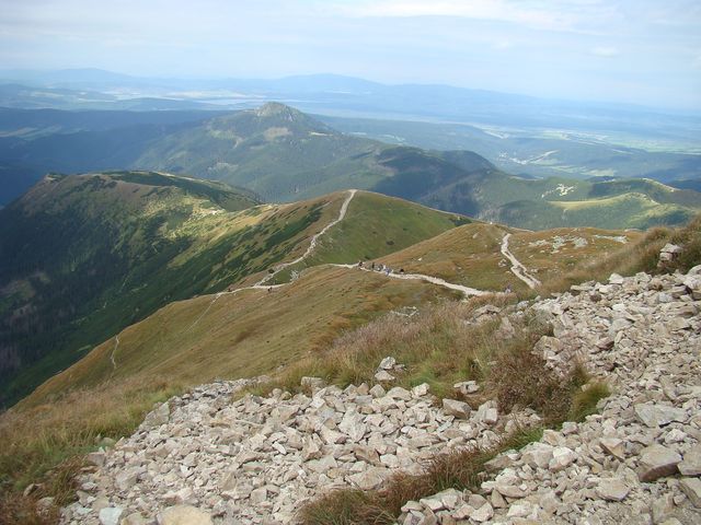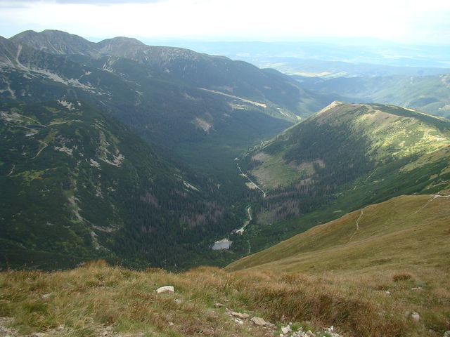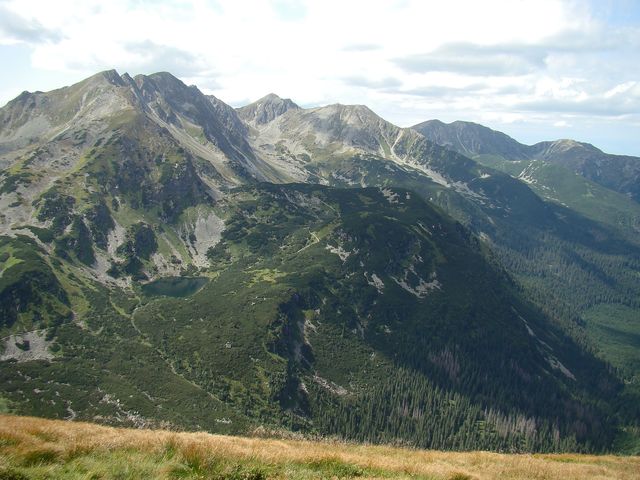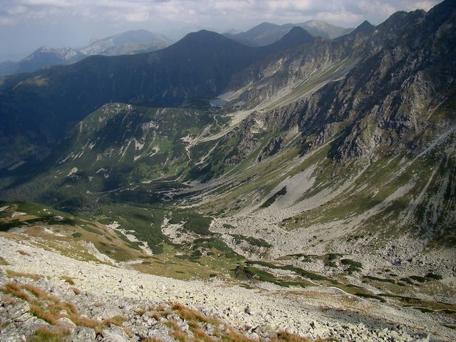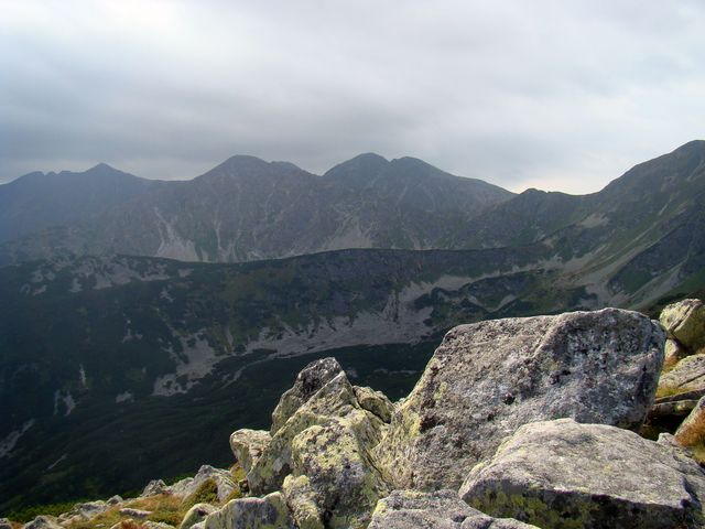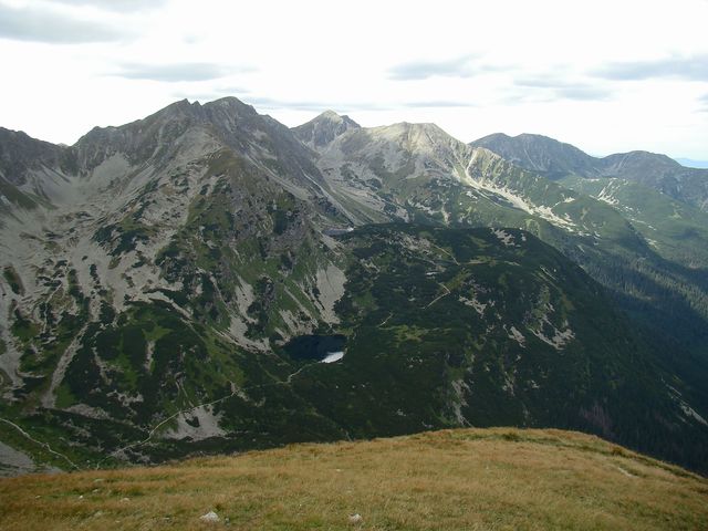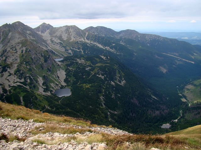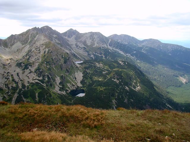 Na dalším obrázku je zřetelně vidět naše včerejší trasa – zprava tušíme Spálený žlab, kterým jsme se dostali na salatínský hřeben, výrazná je Brestová, dále dvojvrchol Salatína, Skriniarky jsou schované za Spálenou, jejíž plochý vrchol pokračuje hřebenem, z něhož ční Pachola. Spálená dolina je ve spodní části zúžena morénovou, řekla bych tribunou, na níž se k potěše tisíců turistů rozložila čtyři Roháčská plesa. Jsou ve výšce od 1560 metrů do 1720 metrů a přitahují jako magnet. Dole v Roháčské dolině je pleso Ťatliakovo, u chaty, kterou jsme z vrcholu Volovce jasně viděli – na fotce ji jen cítíme.