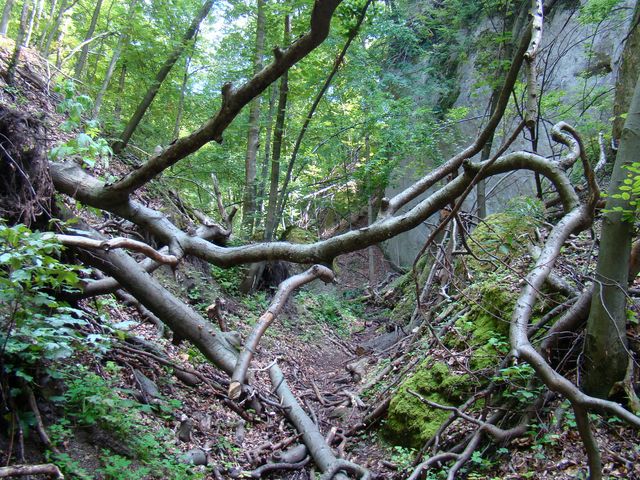Procházeli jsme CHKO Strážovské vrchy a souhlasili, že okolní krajina je opravdu hodna ochrany, ze strmých svahů vyčnívaly hrozivě vysoké šedivé kamenné jehly, sametový mech na balvanech hladil oči a lákal ruce, mezi stromy se tu a tam prodralo slunce…