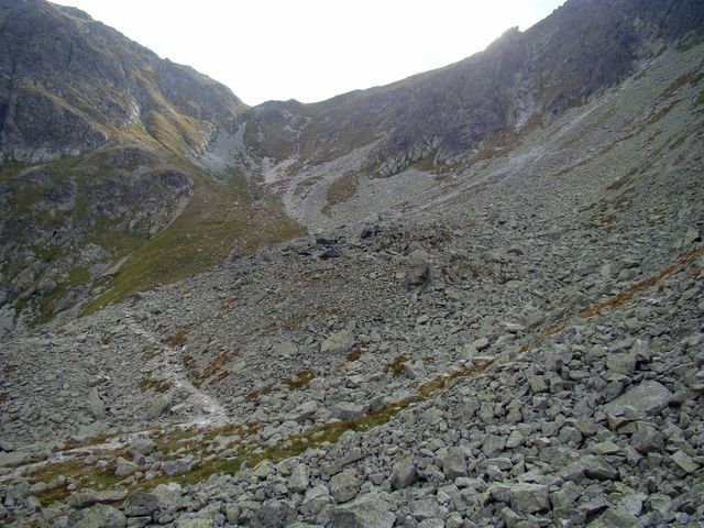 Konečně jsme byli na kamenité, po minulém náročném úseku zcela pohodlné cestě 🙂 a mašírovali jsme opuštěnou Spálenou dolinou do civilizace. Závěr doliny za námi hlídal vpravo od sedla mohutný Baníkov (2178 m), vlevo Pachola, chodník se klikatil v hlubokém balvanitém žlabu vytvořeném dávným ledovcem. Vtom se objevily mraky nad Hrubou kopou a značnou rychlostí začaly narůstat, temnět a během pár minut se spustil prudký liják, naštěstí hromy se ozývaly zdaleka. Skočili jsme do pláštěnek, za deset minut vysvitlo na deset minut slunce, to už jsme se blížili do zelené části doliny.