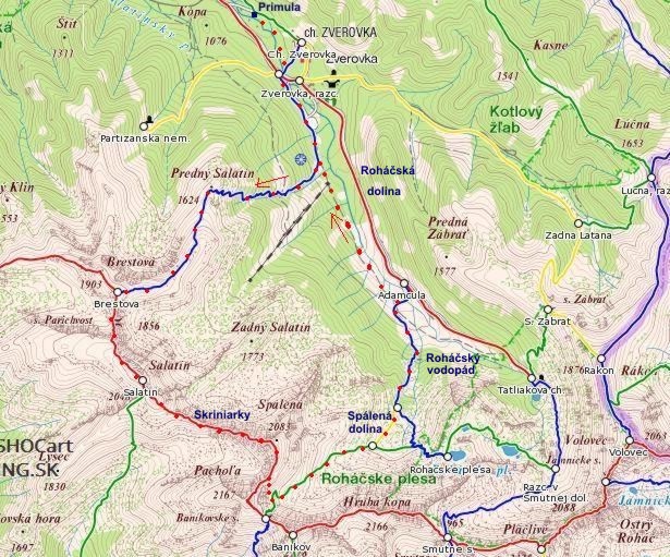 Denní trasa: Primula ZTZ – Zverovka MTZ – parkoviště – Spálený žlab – Přední Salatín – Brestová ČTZ – sedlo Parichvost – Salatín – Skriniarky – Spálená – Spálená dolina ŽTZ – rozcestí pod Roháčskými plesy MTZ – Roháčský vodopád – Roháčská dolina – Zverovka – Primula = asi 20 km, převýšení 1500 metrů, šli jsme přes devět hodin (včetně ranní prohlídky okolí Zverovky).