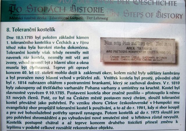 Toleranční kostely vznikaly, za dodržení přísných stavebních nařízení, od vydání tzv. Tolerančního patentu v roce 1781 do vydání Protestantského patentu v roce 1861. Kostelík v Humpolci byl postaven v roce 1785 jako jeden z prvních v Čechách.